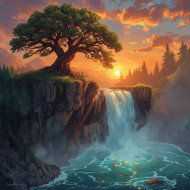 A breathtaking digital painting featuring a mighty tree standing proudly on a cliff above a cascading waterfall. The glowing sunset
